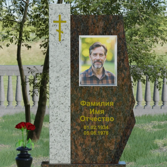 Геометрия стелы идеально сбалансирована для размещения ключевых элементов оформления. На левой вертикальной вставке из красного гранита традиционно располагается лаконичный православный крест, выполненный методом глубокой гравировки с последующим покрытием сусальным золотом или высокопрочной краской «под золото». Это придает композиции сакральный смысл и завершенность. Основное пространство черной стелы отведено под портрет и мемориальные надписи. Форма памятника позволяет интегрировать как классическую лазерную гравировку с фотографической точностью, так и современный фотокерамический портрет в изящной рамке. Золоченые буквы фамилии и дат жизни, выполненные академическим шрифтом, создают великолепный контраст с темным фоном, обеспечивая отличную читаемость даже на расстоянии.