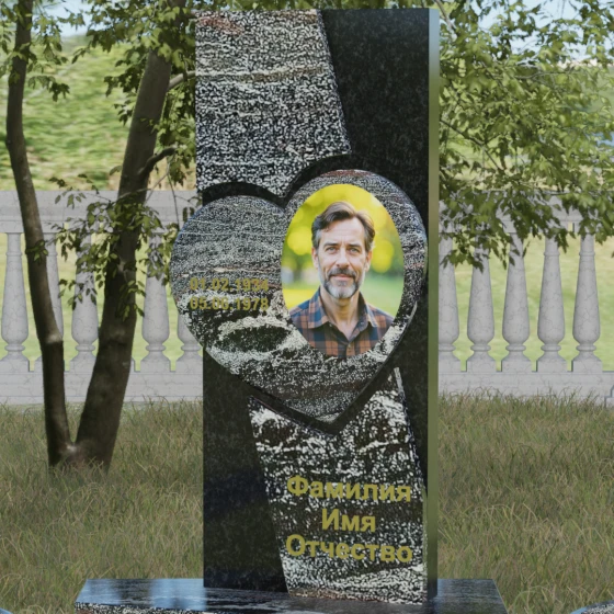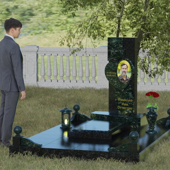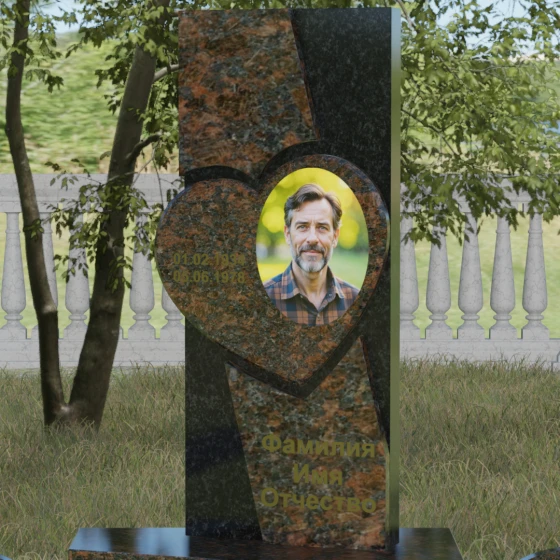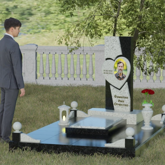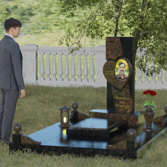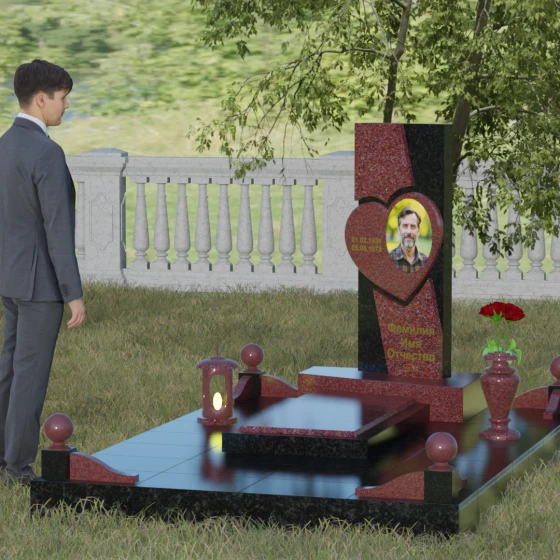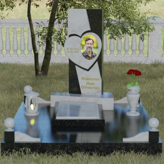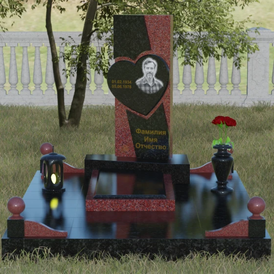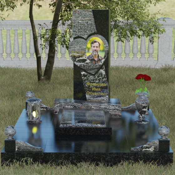 Кому подойдет: Данная модель является универсальной, однако за счет центрального символа — сердца — чаще всего выбирается для оформления женских захоронений. Она станет достойным выражением любви и вечной памяти для матери, супруги, дочери или сестры. Сложная геометрия и наличие декоративных элементов (вазы, шаров) делают это ритуальное изделие идеальным выбором для тех, кто ищет современный, эстетически насыщенный мемориал, сочетающий в себе европейский стиль и традиционную прочность натурального камня.