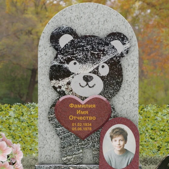 Данная мемориальная композиция представляет собой уникальное сочетание трогательной нежности и величественной непоколебимости камня. В центре художественного замысла лежит глубокий символизм: фигура медвежонка, бережно держащего в лапах сердце, олицетворяет чистоту, бесконечную родительскую любовь и защиту, которую близкие стремятся подарить даже после ухода дорогого человека. Это надгробие из натурального камня выполнено в технике художественного комбинирования различных пород, что создает потрясающий визуальный объем. Массивная светлая стела с полукруглым завершением служит идеальным фоном для темного силуэта, вырезанного с ювелирной точностью. Игра контрастов между зеркальной полировкой черного камня и благородной текстурой светлого гранита подчеркивает каждую деталь: от доброго взгляда лесного покровителя до мягких контуров его фигуры.