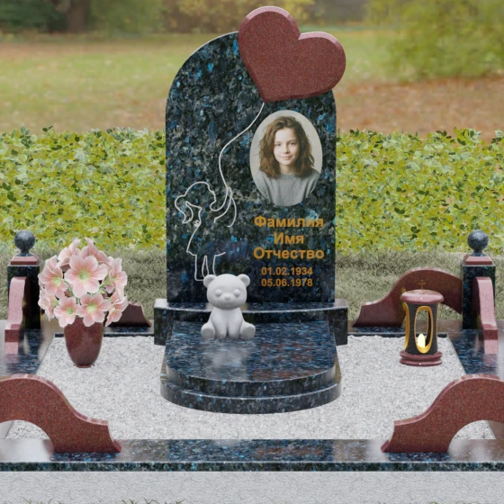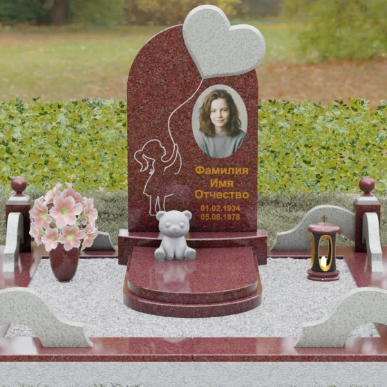 Представленная мемориальная композиция — это не просто надгробие, а глубокое художественное высказывание, в котором застыло мгновение нежности и вечной связи. Основная стела выполнена в форме изящной асимметричной арки из глубокого черного гранита. Главным акцентом ансамбля выступает объемное сердце из насыщенного красного камня, которое словно парит в воздухе, подобно легкому воздушному шару. Тонкая, едва уловимая линия резьбы соединяет этот символ любви с рукой выгравированного силуэта маленькой девочки. Мастерски исполненная гравировка ребенка с хвостиком, тянущегося вверх, придает всей конструкции невероятную легкость и трогательность. Игра контрастов здесь возведена в абсолют: зеркальная полировка черного обелиска соседствует с ярким цветом сердца, создавая эффект трехмерного пространства и визуального объема.