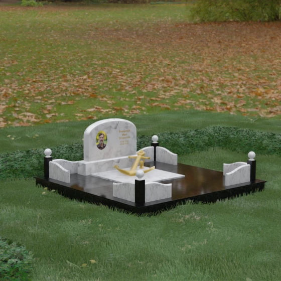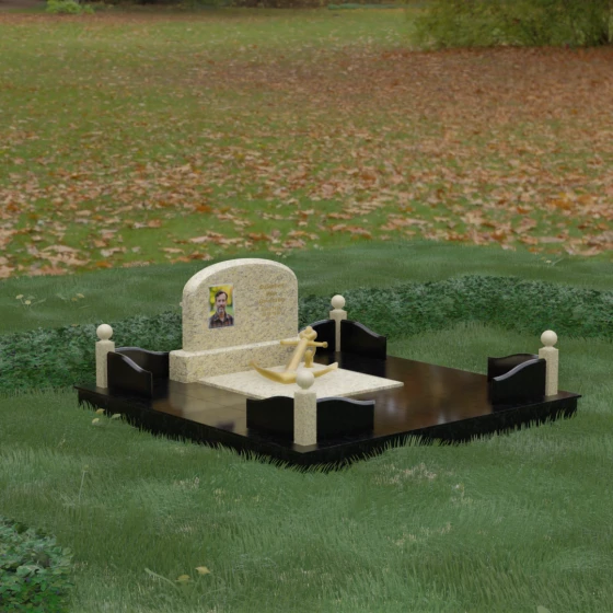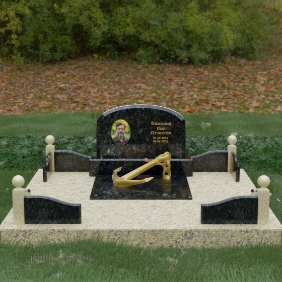 • Центральный символ: На надгробной плите расположен объемный декоративный элемент в виде золотого якоря с массивной цепью. Этот символ олицетворяет надежду, твердость характера и профессиональный путь, связанный со стихией, становясь смысловым центром всего мемориала.