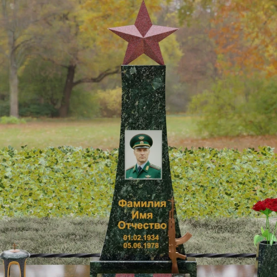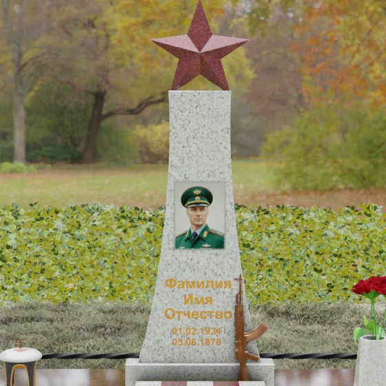 Портрет на данной модели традиционно выполняется в виде прямоугольной керамики или вставки в нишу, что позволяет сохранить фотографическую точность и яркость красок военного мундира на долгие годы. Расположение портрета на центральной оси стелы обеспечивает гармоничную композицию, где взгляд офицера обращен к приходящим. Этот памятник станет достойным финальным аккордом в истории жизни настоящего защитника, воплощая в холодном камне теплоту вашей любви и безграничную гордость за его путь.
