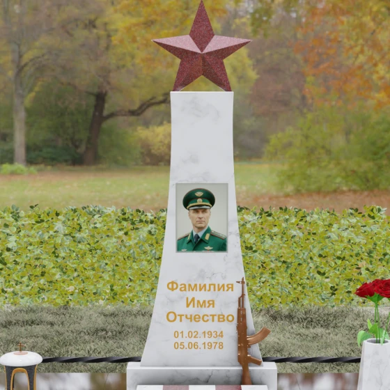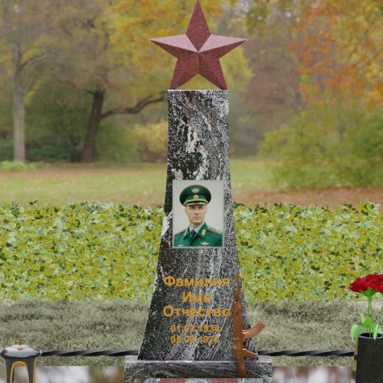 Мемориальный комплекс под артикулом 190 — это воплощение мужества, дисциплины и вечной памяти о человеке, чья жизнь была неразрывно связана с воинским долгом. Центральное место в композиции занимает высокая вертикальная стела, имеющая строгую, сужающуюся кверху геометрию. Такая форма выбрана неслучайно: она создает мощную визуальную вертикаль, направляющую взгляд зрителя ввысь, символизируя духовное восхождение и бессмертие подвига. Венчает монумент объемная пятиконечная звезда насыщенного красного цвета — символ чести и принадлежности к офицерскому корпусу. Одной из самых значимых и уникальных деталей данной модели является реалистично выполненная объемная фигура автомата Калашникова, прислоненного к боковой грани стелы. Этот элемент резьбы выполнен с безупречной точностью, подчеркивая профессиональный путь усопшего. Надгробие из натурального камня в таком исполнении выглядит величественно и бескомпромиссно, заявляя о силе характера того, кому оно посвящено.
