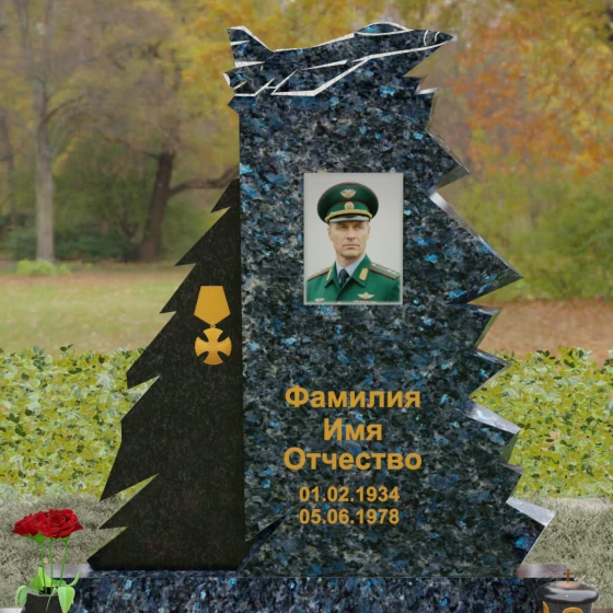 Надгробие из натурального камня (Артикул 202) — это монументальная композиция, созданная для того, чтобы увековечить память о человеке чести, чья жизнь была неразрывно связана с небом и служением отечеству. Архитектурное решение стелы поражает своей динамикой и символизмом: в верхней части монумента застыл в стремительном взлете силуэт современного истребителя, выполненный с ювелирной точностью. Левая грань памятника решена в виде резных, асимметричных выступов, напоминающих ветви северной ели или ломаные линии скалистого утеса. Такая геометрия придает мемориалу мужественный, волевой характер, подчеркивая стойкость и твердость духа ушедшего. Игра ломаных линий и острых углов создает ощущение мощи, которое невозможно передать в классических прямоугольных формах.