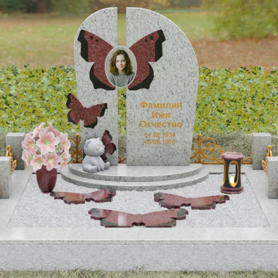 Центральным элементом ансамбля выступает величественная вертикальная стела, разделенная узким вертикальным просветом на две симметричные части. Этот архитектурный прием создает эффект воздушности и позволяет свету проникать сквозь плотную массу камня, символизируя открытость небесных врат и свободу духа. Верхушка стелы оформлена плавным полукруглым изгибом, лишенным острых углов, что дарит ощущение абсолютного умиротворения и вечного покоя. Главным художественным акцентом является мастерски выполненная инкрустация в виде расправленных крыльев бабочки, которые бережно обрамляют центральный овальный портрет. Контрастная игра фактур — зеркально-черного полированного гранита и насыщенных красных вставок с белым природным рисунком — создает поразительный визуальный объем. Изящная золоченая гравировка шрифта придает оформлению особую торжественность, отчетливо выделяясь на темном фоне камня и сохраняя читаемость на долгие десятилетия.
