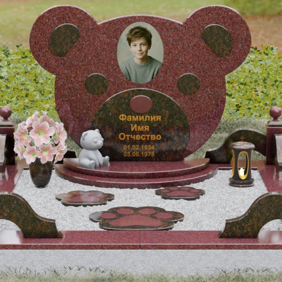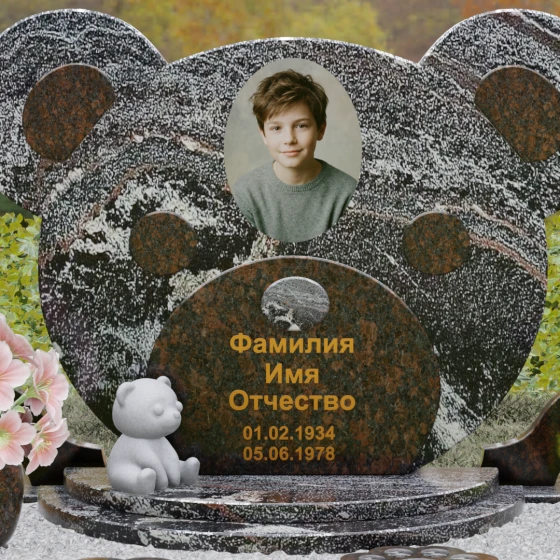 Эта мемориальная композиция представляет собой уникальный художественный проект, созданный для того, чтобы выразить бесконечную нежность и светлую печаль. Главная стела выполнена в форме головы медвежонка — символа чистоты, детства и вечного сна. Плавные, округлые линии силуэта лишены острых углов, что придает изделию визуальную мягкость и умиротворение. Мастера-камнерезы виртуозно передали геометрию образа: симметричные ушки со светлыми вставками и выразительные круглые глаза, созданные методом инкрустации камня другого оттенка. Игра контрастов между глубоким темным основанием и светлым матовым срезом декоративных элементов создает эффект живого объема, заставляя свет играть на полированных гранях и подчеркивая безупречную пластику камня.