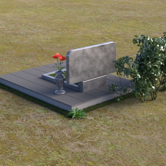 Особое внимание привлекает игра света и тени на полированных гранях. Лучи солнца, скользя по поверхности, создают эффект объема, подчеркивая глубину и фактуру камня. Стела водружена на основание, состоящее из двух элементов: горизонтальной плиты, выполненной в той же зеркальной полировке, что и стела, и более широкой подставки серого цвета с матовой фактурой, разделенной на прямоугольные сегменты. Такое решение создает ощущение надежности и основательности, подчеркивая вечность памяти. Рядом со стелой располагается ваза из черного гранита, выполненная в классическом стиле, предназначенная для живых цветов – символа жизни и продолжения памяти.