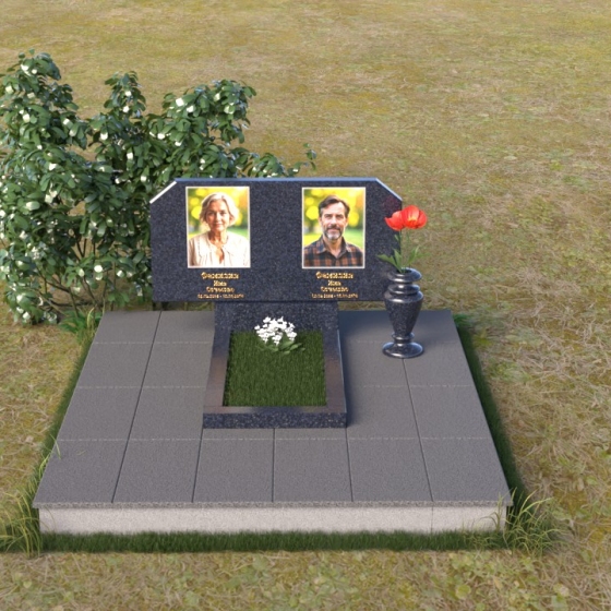 Форма стелы этого памятника предоставляет широкие возможности для оформления. Помимо портретов, на ней можно разместить эпитафии, религиозные символы или другие памятные надписи. Расположение портретов может быть как горизонтальным, как показано на изображении, так и вертикальным, в зависимости от ваших пожеланий. Важно помнить о гармоничном соотношении размеров портретов и остального текста, чтобы создать сбалансированную композицию. Гранитная подставка обеспечивает устойчивость всей конструкции и может быть дополнена цветником или другими элементами благоустройства. Черный цвет камня идеально сочетается с любыми оттенками цветов, поэтому вы можете смело экспериментировать с оформлением, создавая уникальный и запоминающийся образ. Ваза, входящая в комплект, предназначена для размещения живых или искусственных цветов. Она выполнена в строгом стиле и гармонично дополняет общую композицию памятника.