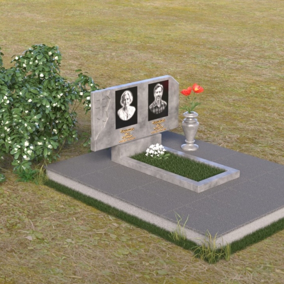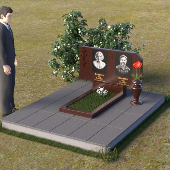 В верхней части памятника располагается вертикальная стела прямоугольной формы с небольшими скошенными углами, придающими ей более мягкий и благородный вид. На поверхности стелы размещены два портрета усопших, выполненные с высокой детализацией. В левом верхнем углу вырезано изображение православного креста, выполненного в лаконичном стиле, подчеркивающем сдержанность и глубину веры. Справа от портретов вырезана изящная роза с детально проработанными лепестками, символизирующая любовь и вечную память. Нижняя часть стелы плавно переходит в горизонтальную плиту, на которой размещается табличка с именами и датами жизни усопших. Горизонтальная плита, в свою очередь, опирается на строгий постамент, обеспечивающий устойчивость всей конструкции.