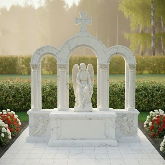 Мемориальная композиция ПН 044 представляет собой величественное архитектурное сооружение, в котором слились воедино классические мотивы и глубокий символизм. Центральное место занимает изящная скульптура скорбящего ангела, выполненная из светлого мрамора. Его фигура, облаченная в мягкие драпировки, склонена в вечной молитве, а крылья бережно сложены за спиной, создавая ощущение покоя и умиротворения. Лицо ангела выражает глубокую скорбь, но при этом излучает светлую надежду, становясь воплощением чистоты и невинности. Детализация скульптуры поражает: каждая складка одеяния, каждый завиток волос проработаны с ювелирной точностью, придавая образу реалистичность и эмоциональную глубину.