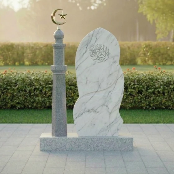 Поверхность стелы представляет собой великолепную игру контрастов. Основная часть выполнена из глубокого черного гранита с зеркальной полировкой, которая отражает свет, создавая ощущение глубины и торжественности. На этом фоне выделяется вставка из светлого мрамора, расположенная в верхней части и плавно переходящая в изящную волну, опоясывающую стелу. Эта вставка, напоминающая очертания исламского полумесяца, символизирует свет и надежду. На матовой поверхности светлого мрамора искусно выгравированы каллиграфические узоры, которые добавляют монументу культурную и духовную ценность. В нижней части стелы, на черном граните, также присутствует тонкий орнамент, выполненный в технике гравировки, который подчеркивает изысканность и детализацию всей работы.