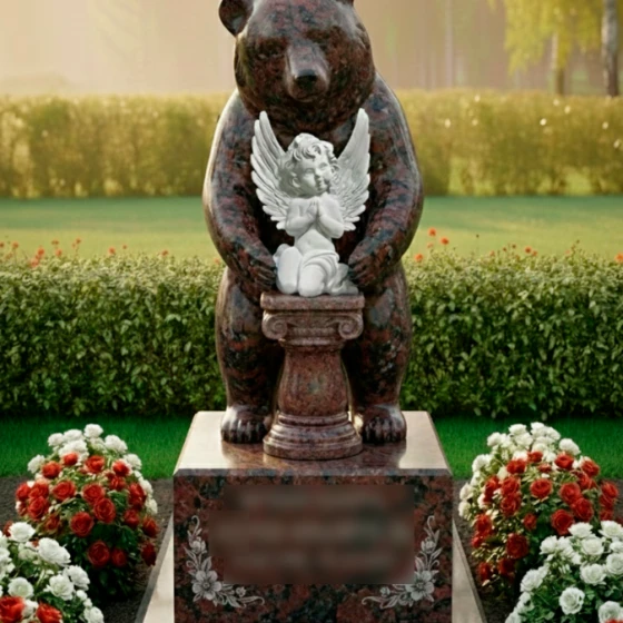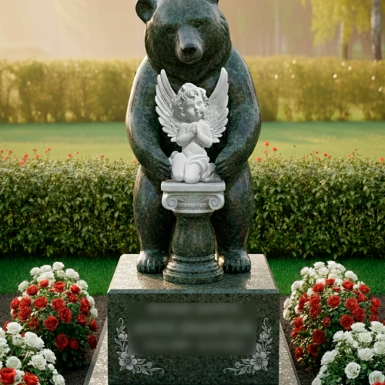 Выбор образа медведя в качестве хранителя не случаен — это символ силы, защиты и непоколебимого спокойствия. В данной интерпретации могучий зверь выступает защитником души, олицетворенной в образе маленького ангела. Ангел с молитвенно сложенными руками и детально проработанными перьями на крыльях символизирует чистоту, надежду и связь с высшими силами. Вся архитектурная группа транслирует идею безопасности: покой ушедшего человека находится под надежной защитой, которую не в силах разрушить ни время, ни внешние обстоятельства. Это воплощение вечной опеки и преданности, застывшее в граните.