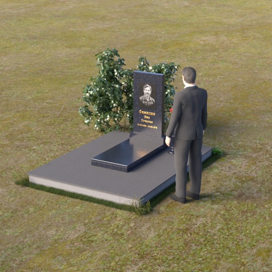Мемориальная композиция представляет собой вертикальную стелу, выполненную в строгой прямоугольной форме, символизирующей стойкость и незыблемость памяти. Верхняя часть стелы, с ее четкими гранями, словно устремлена ввысь, к небесам, напоминая о духовной составляющей человеческой жизни. Боковые грани стелы обработаны с особой тщательностью, создавая эффект благородной сдержанности. Фаска, аккуратно снятая по периметру, придает изделию завершенный и элегантный вид. Горизонтальная плита, расположенная перед стелой, выполнена в зеркальной полировке, отражая небо и окружающий мир, символизируя продолжение жизни и связь с ушедшим.