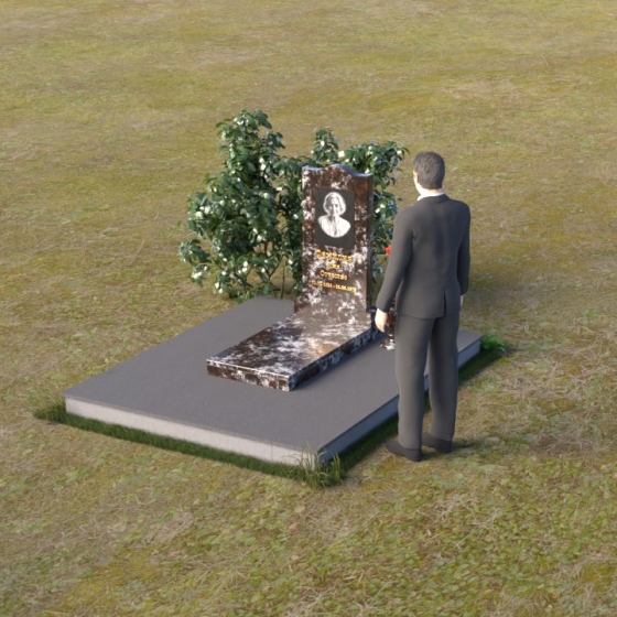 Величественная стела памятника ПВ 008 представляет собой элегантное сочетание строгих линий и плавных изгибов. Верхняя часть стелы имеет волнообразную форму, смягчающую строгость камня и придающую ей утонченность. Грани стелы тщательно отполированы до зеркального блеска, отражая свет и создавая ощущение легкости и воздушности. На лицевой стороне стелы размещен портрет усопшего, выполненный методом гравировки. Ниже располагаются надпись с именем и датами жизни. Под стелой расположена горизонтальная плита, также выполненная из полированного гранита. Ее строгие прямоугольные формы контрастируют с плавными линиями стелы, подчеркивая ее выразительность. Фаски по периметру плиты смягчают углы и придают ей завершенный вид. Рядом со стелой установлена небольшая ваза из темного гранита с изящным орнаментом, предназначенная для живых цветов.
