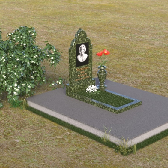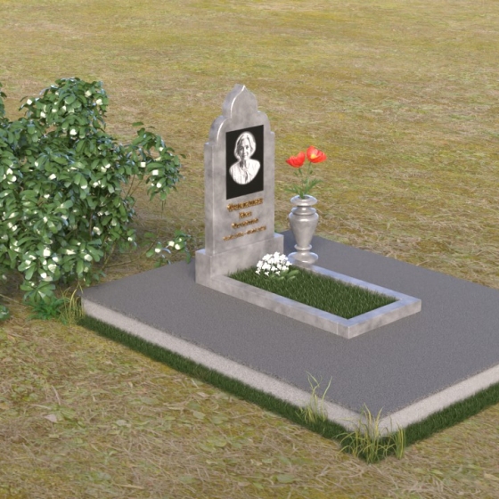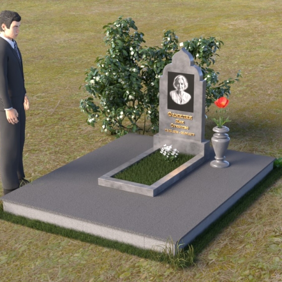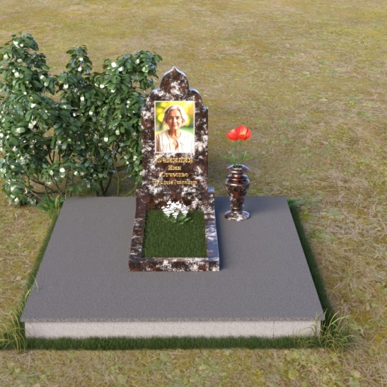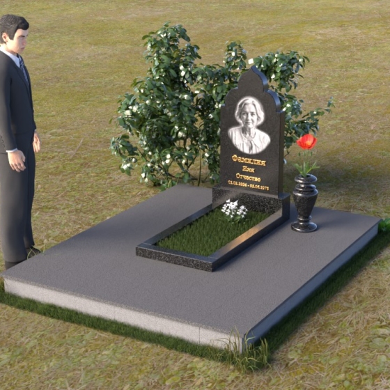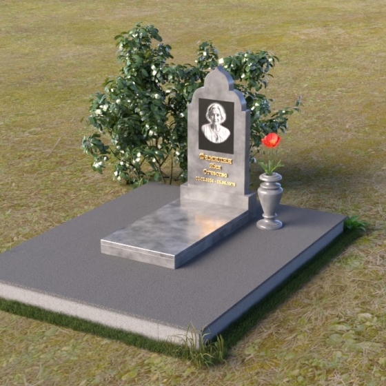 Основание композиции – прямоугольная плита с ровной, матовой поверхностью, обеспечивающая надежную устойчивость всей конструкции. На ней располагается горизонтальная плита, выполненная в виде усеченного параллелепипеда с зеркально отполированной поверхностью. Эта плита создает эффект глубины и отражает окружающий мир, словно запечатлевая моменты жизни ушедшего. Вертикальная стела возвышается над горизонтальной плитой, ее верхняя часть выполнена в форме изящной арки с плавными изгибами. Арка завершается небольшим декоративным элементом, напоминающим купол, что придает памятнику особую выразительность и духовность.