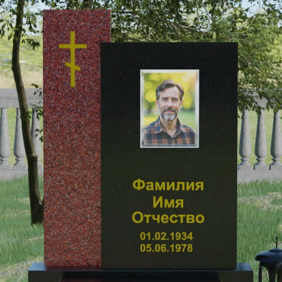 Визуальное решение данного мемориала строится на благородном контрасте двух вертикальных элементов, что позволяет создать глубокий и многогранный художественный образ. Композиция состоит из двух стел разной высоты, установленных внахлест. Более высокая и узкая стела служит духовным стержнем комплекса: на её полированной поверхности закреплен лаконичный православный крест. Его строгие линии и золотистое покрытие подчеркивают святость места и символизируют надежду на вечную жизнь. Широкая основная панель выступает в качестве смыслового центра, где располагается портрет и основные памятные надписи. Использование фотокерамики или портрета на стекле в специальной нише придает образу особую четкость и глубину, гармонируя с зеркальной поверхностью камня.