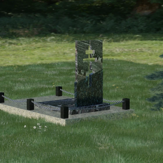 Особое внимание уделено комплексному благоустройству места захоронения. Скульптурная композиция установлена на массивный гранитный цоколь, который служит надежным фундаментом. Участок полностью закрыт сплошной надгробной плитой, выполненной в единой цветовой гамме со стелой. Такое решение не только придает мемориалу завершенный, монументальный вид, но и значительно упрощает уход за местом памяти: вам не придется бороться с сорняками или обновлять грунт. Периметр участка обозначен строгими каменными столбиками, соединенными декоративными цепями, что создает атмосферу защищенности и уединения, отделяя священное место от остального мира.