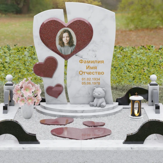 Оформление: Уникальная геометрия этого надгробия сама подсказывает идеальное расположение гравировки. Крупное центральное сердце словно создано для размещения портрета — здесь он будет главным смысловым акцентом, защищенным символом любви. Правую, более широкую часть плиты, рекомендуется использовать для нанесения Фамилии, Имени, Отчества и дат жизни. Здесь же останется достаточно места для проникновенной эпитафии или дополнительного декоративного элемента, например, небольшой виньетки или креста.
