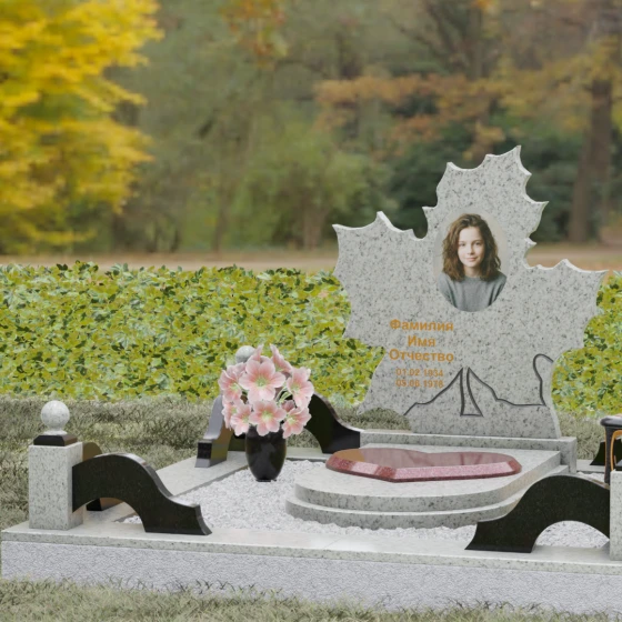 Данная мемориальная композиция — это воплощение глубокого уважения и вечной памяти, облаченное в художественную форму. Выбор формы кленового листа не случаен: в мировой символике он олицетворяет силу духа, красоту жизненного пути и мудрость. Каждая линия этой стелы пропитана эстетикой природного изящества. Резные края листа выполнены с филигранной точностью, создавая сложный, многогранный силуэт, который выделяется на фоне классических строгих форм. Плавные изгибы и отсутствие агрессивных углов призваны дарить чувство покоя и умиротворения, подчеркивая, что душа близкого человека обрела вечный приют в гармонии.