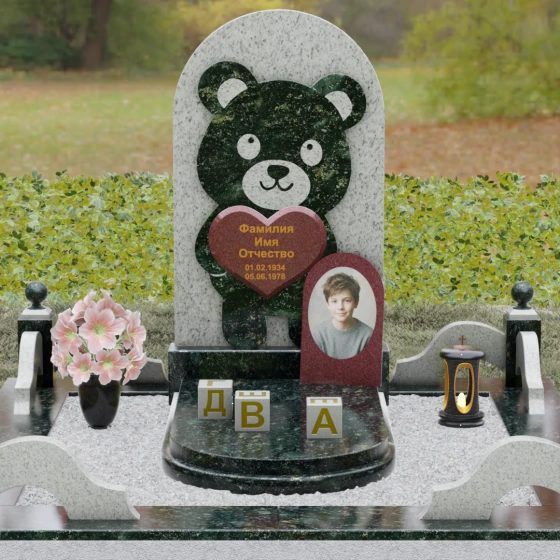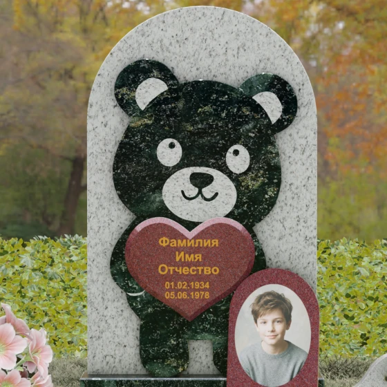 Данная мемориальная композиция представляет собой уникальное сочетание трогательной нежности и величественной непоколебимости камня. В центре художественного замысла лежит глубокий символизм: фигура медвежонка, бережно держащего в лапах сердце, олицетворяет чистоту, бесконечную родительскую любовь и защиту, которую близкие стремятся подарить даже после ухода дорогого человека. Это надгробие из натурального камня выполнено в технике художественного комбинирования различных пород, что создает потрясающий визуальный объем. Массивная светлая стела с полукруглым завершением служит идеальным фоном для темного силуэта, вырезанного с ювелирной точностью. Игра контрастов между зеркальной полировкой черного камня и благородной текстурой светлого гранита подчеркивает каждую деталь: от доброго взгляда лесного покровителя до мягких контуров его фигуры.