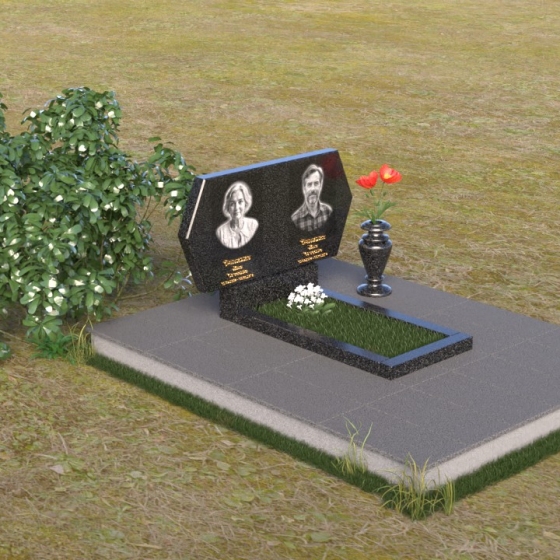 Величественная стела памятника ПГ004 представляет собой элегантное сочетание строгих линий и мягких, сглаженных углов. Верхняя часть имеет форму, близкую к прямоугольнику, но с деликатно скошенными верхними углами, что придает ей визуальную легкость и утонченность. Боковые грани плавно переходят в лицевую поверхность, создавая ощущение обтекаемости и завершенности. Фаска по периметру лицевой стороны подчеркивает четкость контура и добавляет дополнительный объем. Нижняя часть стелы, служащая основанием для размещения информации и портретов, выполнена в форме прямоугольной призмы, гармонично сочетающейся с основной частью памятника. Подставка под вазу выполнена в классическом стиле и имеет плавные обтекаемые формы.
