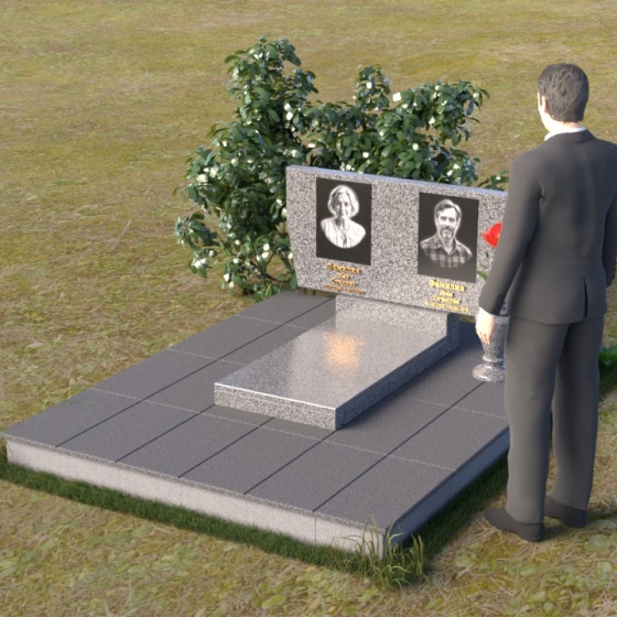 Это ритуальное изделие представляет собой гармоничное сочетание прямых линий и мягких, едва уловимых изгибов, создающих ощущение покоя и умиротворения. Стела имеет прямоугольную форму, но ее верхняя грань слегка скошена, что придает ей визуальную легкость и динамику. Обратите внимание на зеркальную полировку лицевой стороны – она отражает небо и окружающий мир, словно заключая в себе вечность. На полированной поверхности выгравированы портреты усопших и памятные надписи, выполненные с высокой точностью и детализацией. Слева от стелы, на основании, располагается небольшая горизонтальная плита с аналогичной полировкой, создающая дополнительное пространство для цветов или памятных предметов. Основание памятника выполнено из серого камня с матовой фактурой, что создает контраст с блестящей стелой и придает композиции устойчивость и завершенность. Рядом с плитой установлена ваза, выполненная из того же черного полированного гранита, что и стела, что обеспечивает единство стиля и служит достойным обрамлением для живых цветов, символизирующих вечную память.