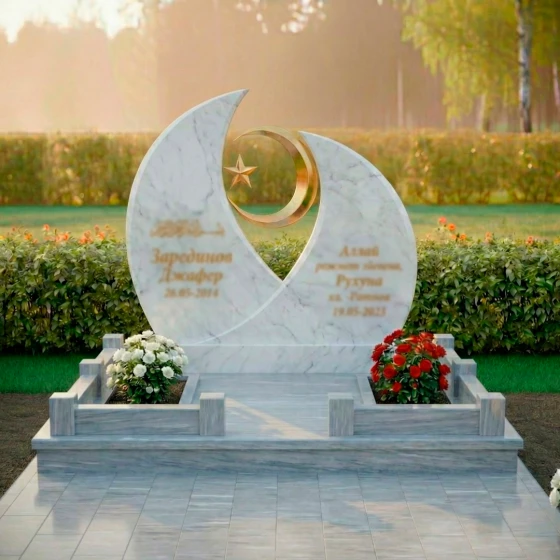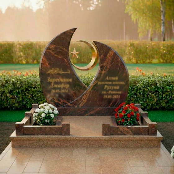 Модель ПН 157 представляет собой истинное произведение искусства, воплощенное в камне, призванное стать вечным символом памяти и уважения. Величественная стела, выполненная в глубоком черном цвете, мгновенно притягивает взгляд своей необычной, но гармоничной формой. Ее силуэт напоминает два полумесяца, обращенных друг к другу, создавая динамичную композицию, которая символизирует единство и бесконечность. В центре этой дуальности, словно небесное светило, парит золотистый полумесяц, в объятиях которого покоится изящная пятиконечная звезда. Этот центральный элемент выполнен с ювелирной точностью, его отполированная до зеркального блеска поверхность отражает свет, создавая ощущение невесомости и духовности. Грани стелы тщательно обработаны, демонстрируя безупречную гладкость и плавные переходы, которые подчеркивают естественную красоту камня. Зеркальная полировка черного гранита создает эффект глубокого космоса, в котором каждый луч света играет и преломляется, обещая сохранить свой первозданный блеск на столетия, неподвластный времени и стихиям.