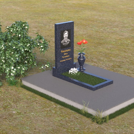 Мемориальная композиция представляет собой вертикальную стелу, выполненную в строгой прямоугольной форме, символизирующей стойкость и незыблемость памяти. Верхняя часть стелы, с ее четкими гранями, словно устремлена ввысь, к небесам, напоминая о духовной составляющей человеческой жизни. Боковые грани стелы обработаны с особой тщательностью, создавая эффект благородной сдержанности. Фаска, аккуратно снятая по периметру, придает изделию завершенный и элегантный вид. Горизонтальная плита, расположенная перед стелой, выполнена в зеркальной полировке, отражая небо и окружающий мир, символизируя продолжение жизни и связь с ушедшим.