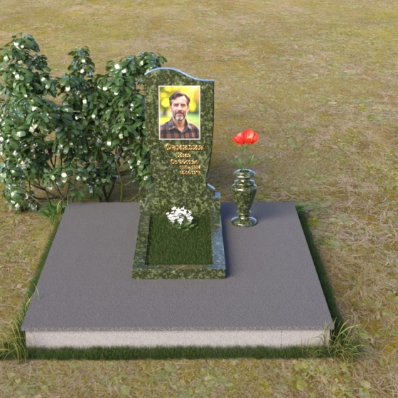 Величественная стела памятника ПВ 015 выполнена в строгой, но элегантной форме. Верхняя часть памятника имеет плавный, волнообразный силуэт, что придает ему мягкость и изящество. Сглаженные углы и отсутствие острых граней создают ощущение покоя и умиротворения. Боковые грани стелы слегка скошены, что визуально облегчает конструкцию и добавляет ей динамичности. Фаска, обрамляющая верхнюю часть памятника, подчеркивает его контур и придает завершенность образу. Нижняя часть стелы, переходящая в тумбу, имеет строгую прямоугольную форму, обеспечивая устойчивость и надежность всей конструкции. Зеркальная полировка поверхности камня отражает окружающий мир, создавая ощущение глубины и света. На стеле располагается портрет усопшего, выполненный с высокой точностью и детализацией, а также памятная надпись, нанесенная золотыми буквами.