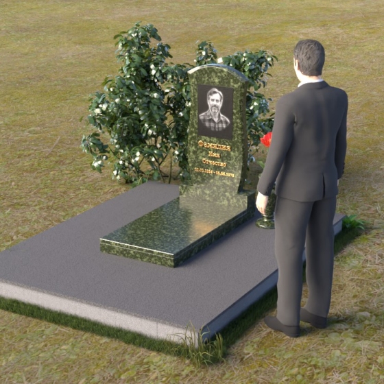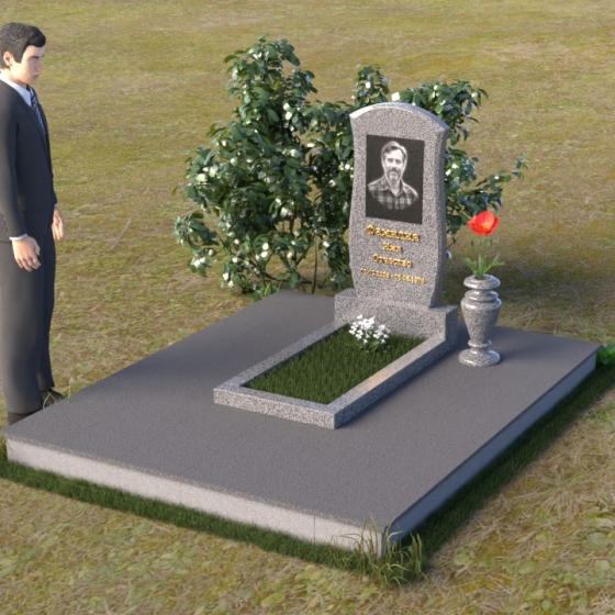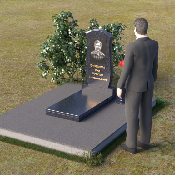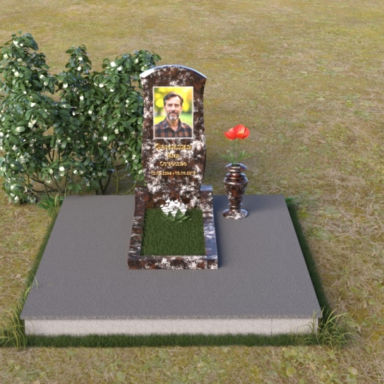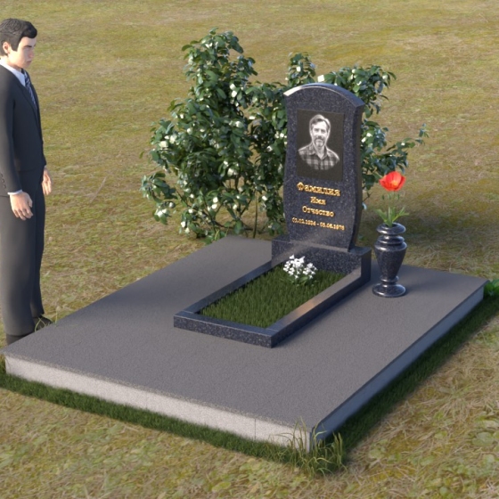 Данная модель предоставляет широкие возможности для индивидуального оформления. Портрет усопшего, выполненный методом гравировки, идеально вписывается в общую композицию, занимая центральное место на стеле. Золотистые буквы надписи, контрастируя с темным фоном полированного гранита, выглядят торжественно и выразительно. Мы рекомендуем выбирать фотографии высокого разрешения для достижения максимальной детализации и реалистичности портрета. Также возможно добавление дополнительных декоративных элементов, таких как эпитафии, религиозные символы или памятные даты. Небольшая подставка, выполненная в том же стиле, что и стела, гармонично дополняет композицию и может служить местом для возложения цветов. Элегантная ваза из черного гранита, расположенная рядом с надгробием, добавляет завершенность образу и позволяет сохранить свежесть цветов на длительное время.