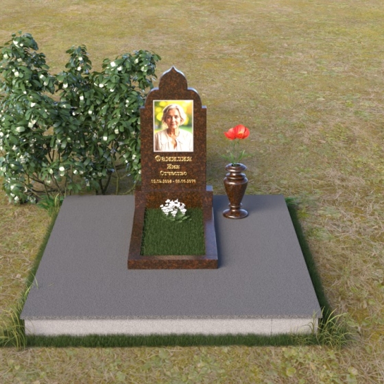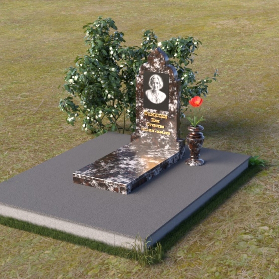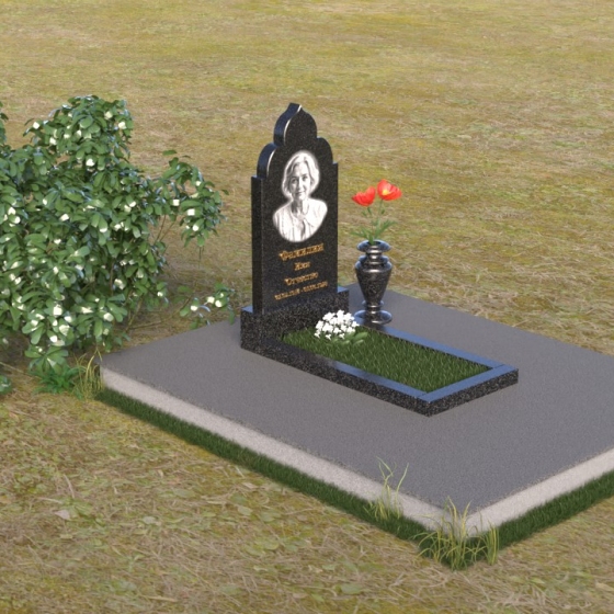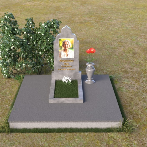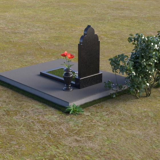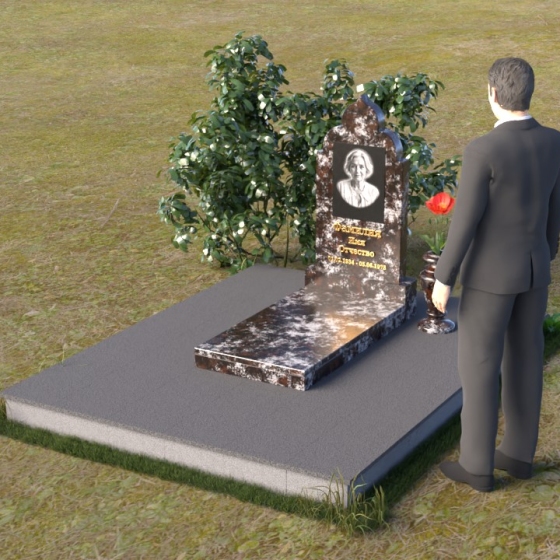 Основание композиции – прямоугольная плита с ровной, матовой поверхностью, обеспечивающая надежную устойчивость всей конструкции. На ней располагается горизонтальная плита, выполненная в виде усеченного параллелепипеда с зеркально отполированной поверхностью. Эта плита создает эффект глубины и отражает окружающий мир, словно запечатлевая моменты жизни ушедшего. Вертикальная стела возвышается над горизонтальной плитой, ее верхняя часть выполнена в форме изящной арки с плавными изгибами. Арка завершается небольшим декоративным элементом, напоминающим купол, что придает памятнику особую выразительность и духовность.